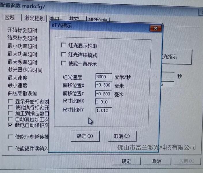 解決方法:紅光指示的范圍與實(shí)際打標(biāo)的范圍不符合,在激光打標(biāo)機(jī)軟件中調(diào)參數(shù),調(diào)節(jié)“紅光指示”欄下的尺寸比例可以解決這個(gè)問題。同時(shí)調(diào)整“偏移位置X”、“偏移位置Y”數(shù)值,使得紅光指標(biāo)范圍與實(shí)際打標(biāo)范圍完全重合。
